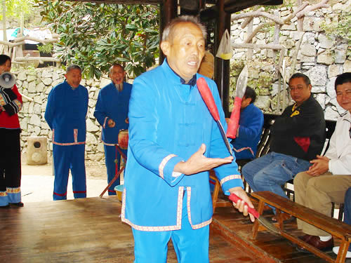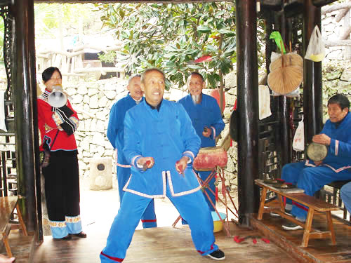 三棒鼓,是以拋三根棒和敲鑼打鼓得名,是土家山寨到處可見(jiàn)的一項(xiàng)以打擊樂(lè)器、口頭文學(xué)、表演技藝合為一體的文體活動(dòng)形式。 打三棒鼓通常由三至五人組成,師傅擊鼓唱詞,一人打鑼?zhuān)蝗怂;ò、花刀。由一人表演,將鼓架擺在前面鼓架上,將鑼掛在鼓架下面,用細(xì)繩系著鑼棒套在腳板上,表演時(shí),口唱詞、手打鼓、腳踩鑼?zhuān)尮墓?jié)拍是按拋花棒、花刀速度的需要而定。三棒鼓的唱詞是五言四句重復(fù)半句組成。即五字一句,四句為一節(jié)。每小節(jié)的第四句要重復(fù)半句。每一小節(jié)擊響鑼鼓四遍。前三句是每唱完擊三響,最后一句唱完即每小節(jié)結(jié)束時(shí)擊響十下。例如唱:"學(xué)打三棒鼓",打"鏘鏘鏘";唱"學(xué)又學(xué)得苦",打"鏘鏘鏘";唱"三歲學(xué)到一十五",打"鏘鏘鏘";唱"學(xué)起呀,學(xué)起走江湖",打"鏘鏘鏘、鏘、鏘、鏘鏘鏘鏘鏘-鏘"。這一小節(jié),每唱一字為一拍,"鏘"為鑼鼓同鳴聲,每聲占一拍,標(biāo)點(diǎn)符號(hào)也占一拍。每拍的快慢取決于花棒下落的速度,任何一個(gè)花棒下落一次均為一拍。因此,如果花棒拋得低,下落的頻率就快,每拍所占時(shí)間就短,反之,花棒拋得高,每拍占的時(shí)間就長(zhǎng)。三棒鼓的第二句和第四句都要求壓韻,一句和三句可壓可不壓. 打三棒鼓的技巧性很強(qiáng),思想要高度集中,拋刀拋棒用力要適度,動(dòng)作要敏捷準(zhǔn)確,稍有疏忽大意,不但表演失敗,還會(huì)被刀劃破手腳或誤傷他人。因此,凡是學(xué)打三棒鼓者,均需經(jīng)常練習(xí)飛拋接技術(shù),做到閉目均能拋接刀棒。因此,土家族青少年經(jīng)常用三個(gè)卵石練習(xí)拋接技術(shù),久而久之,熟能生巧,不但會(huì)拋棒,而且能拋刀。 打三棒鼓的鑼鼓曲牌不變,但唱詞多種多樣,除了固定的《十二月花》等唱詞外,均為即興編詞隨口而唱,唱三棒鼓歌的人,都是腦筋靈活、口才伶俐者。 |
