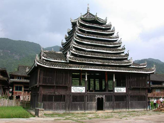 位于通道侗族自治縣坪陽鄉(xiāng)田心寨境內(nèi),始建于清順治年間,為侗族獨特建筑。方形二層樓閣,九層八柱,木結(jié)構(gòu)。邊寬8米,高20米。頂蓋為八角形,上托葫蘆寶頂。封檐板與樓內(nèi)大梁彩繪民間圖畫,各檐翹角飾禽獸浮雕。底層設(shè)火塘,四周置木凳。二樓正面系活動板壁,可兼做戲臺。