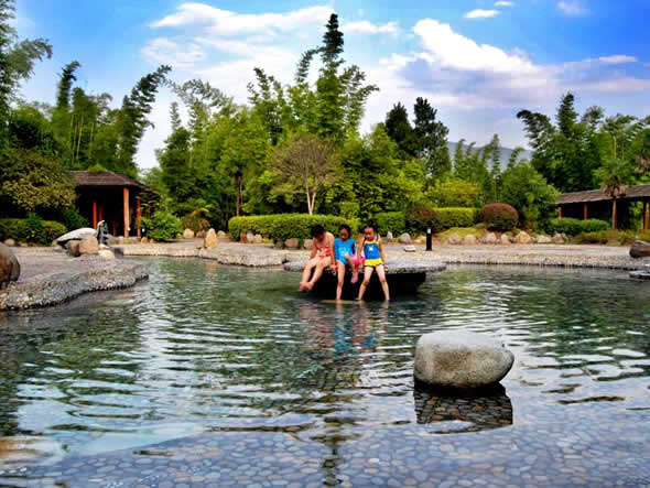 熱水溫泉,位于湘、粵、贛三省交界的熱水鎮(zhèn),是我國南方水溫最高,流量最大,水質(zhì)最好,熱田面積最寬的天然溫泉。熱水水溫一般為 91.5℃,最高達(dá)98℃。熱泉水無色透明,稍有硫化氫氣味,為低礦化、低硬度、高溫弱堿性重碳酸、硫酸-鈉型氟及硅質(zhì)礦泉水,含硅、鈉、鉀、鈣、鍶、硼、氟、氡等三十多種對(duì)人體有益的元素。其中“氡”元素正常情況含量30IMA即可做為生殖系統(tǒng)輔助治療藥物,根據(jù)聯(lián)合國教科文組織官員實(shí)地考察,福泉山莊熱泉水“氡”含量達(dá)到了130IMA左右,對(duì)治療不孕不育的生殖系統(tǒng)疾病有較好的輔助治療效果。