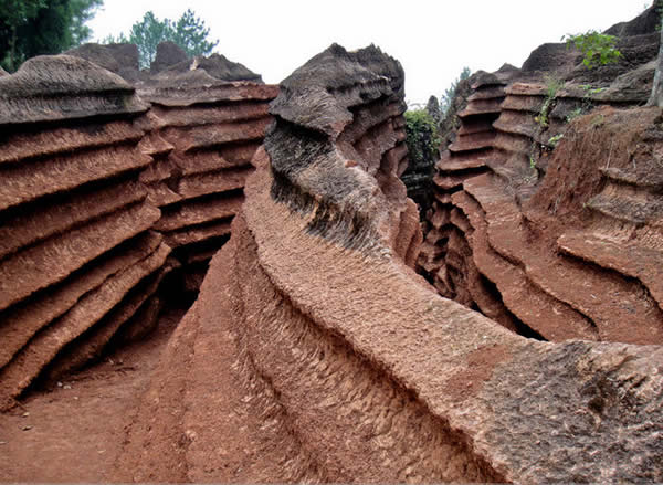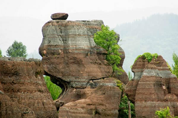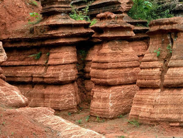 紅石林 告別船工后一切便突然安靜下來(lái),過(guò)山谷的小路沒有人家,偶爾傳來(lái)幾聲清脆的鳥叫。穿過(guò)幾座隘口,峰回路轉(zhuǎn)后“石林”漸漸露臉,石頭的顏色是由灰白到棕紅,變幻而又使人聯(lián)想。間或一棵參天大樹,或是綠竹三兩棵,則又是另一番景致了。于高于低、于肥于瘦的石林,于石于樹、于濃于淡的色彩,顯得雄奇又雋秀,并透露出一種清靈飄逸。 這些石柱不但顏色各異,而且大小不等。有的高達(dá)七、八米,而有些則像半埋于地下的巨獸骨架。一位村民告訴記者,現(xiàn)在石林沒有以前壯觀,都長(zhǎng)渣子(灌木)了。原因是由于山頂樹木減少,雨水將泥土帶下山,很多石頭都被埋在土下,后來(lái)這些地方都開墾了農(nóng)田,石林也被永久覆蓋。 由于泥土覆蓋,石林被切割成一個(gè)個(gè)小區(qū)域,有些隱蔽在果林中,而有些則像突然從天而降,散落田間。