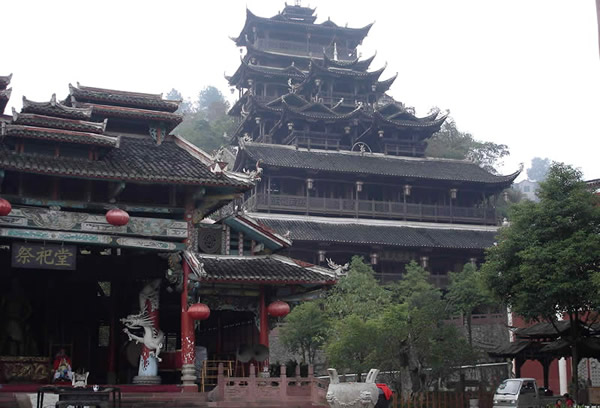 土司城 土司制度初建于五代十國(guó)時(shí)期,到了明朝己非常成熟了,土司王有無(wú)上的權(quán)威,在湘西有三大土司王分別是桑植土司向氏、永順土司王彭氏、慈利土司王張氏,其中又以永順溪州土司彭氏實(shí)力最強(qiáng)。其它土司王都為自己修建一座土司城,唯有彭氏分別在永定、永順修建了二座土司城。在永定的土司城內(nèi),彭氏為顯示其地位,修建了湘西最高的一座高達(dá) 48米,共12層的吊腳樓,整棟樓竟無(wú)一根鐵釘,堪稱土家吊腳樓建筑史上的奇跡,此樓于2002年9月被評(píng)為最高吊腳樓,榮獲世界吉尼斯之最,與此同時(shí)土司城內(nèi)舉辦一千人參加表演的毛古斯舞蹈活動(dòng)獲得圓滿成功,同時(shí)獲得世界吉尼斯之最。進(jìn)入土司城,首先看到土司城迎賓儀式,土家漢子迎賓鼓,吹牛角、放沖,土家姑娘攔門(mén)歌,敬攔門(mén)酒,進(jìn)入城內(nèi),在祭祀堂前舉行百人土家大祭祖活動(dòng),男女老少唱擺手歌、跳擺手舞,登世界最高的吊腳樓九重天,參觀土家族千百年來(lái)文化展示。到土家山寨,聽(tīng)土家歌,賞土家族最有代表風(fēng)俗哭嫁,三棒鼓,花燈等民俗表演。