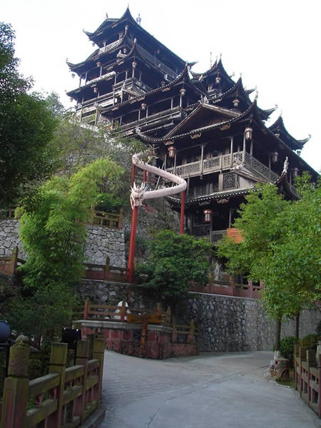 九重天 九重天世襲堂是土家風(fēng)情園的精華和靈魂所在。該建筑由土家民間藝人李宏進(jìn)設(shè)計(jì),依80度陡坡而建,高48米,共9重12層,整個(gè)樓房全部用木栓連接,沒(méi)有一顆鐵釘,堪稱土家族建筑史上的奇跡。2002年9 月22日,九重天吊腳樓被載入世界吉尼斯世界紀(jì)錄,認(rèn)定其為目前中國(guó)最大、最高、最完美的木質(zhì)結(jié)構(gòu)吊腳樓。2001年4月6日,朱镕基總理視察土家風(fēng)情園時(shí),對(duì)九重天贊不絕口:“一批民間匠人能造出這樣輝煌的吊腳樓,而且還解決了力學(xué)的問(wèn)題,真是不簡(jiǎn)單!鼻迦A大學(xué)著名建筑學(xué)家何重義先生說(shuō):“張家界土家風(fēng)情園完全可以和蘇州的園林相媲美。特別是九重天世襲堂,猶如玉宇瓊閣,令人神往!”古人說(shuō),天有九野,地有九州,土有九山,山有九寨。古人又把九重叫做天,說(shuō)天有九重,最上一重是上帝和君主居住的地方,所以我們叫它“九重天”。