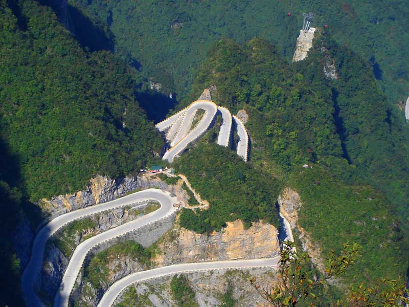| 張家界天門山盤山公路有"通天大道"之稱,盤山公路全長10.77公里,海拔從200米急劇提升到1300米,大道兩側(cè)絕壁千仞,空谷幽深,共計99個彎,180度急彎此消彼長,似玉帶環(huán)繞,彎彎緊連,層層迭起,被譽為“天下第一公路奇觀”。