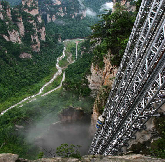 百龍電梯圖片 百龍?zhí)焯輾鈩?shì)恢宏,垂直高差335米,運(yùn)行高度326米,由154米山體內(nèi)堅(jiān)井和172米貼山鋼結(jié)構(gòu)井架等組成,采用三臺(tái)雙層全暴露觀光電梯并列分體運(yùn)行,每臺(tái)次載客50人次,運(yùn)行速度3米/秒,三臺(tái)同時(shí)運(yùn)行每小時(shí)往返量達(dá)4000人次。百龍?zhí)焯莸男藿▽?shí)現(xiàn)“山上游,山下住”的目標(biāo),提供了交通保障,將袁家界天下第一橋、迷魂臺(tái)、天懸白練以及烏龍寨、楊家界等絕世美景從幕后推向了前臺(tái),并將天子山、袁家界、金鞭溪等精品旅游線路連為一體,解決了多年困擾景區(qū)的交通瓶頸問(wèn)題。