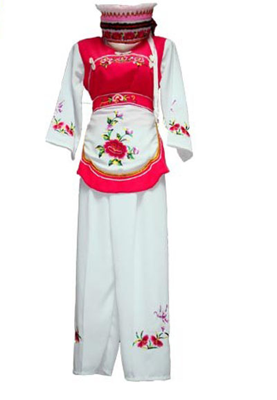 “崇尚白色”是白族人的一個明顯特點(diǎn)。不論男女都愛穿白色服飾,故有“要得俏,一身孝”之說,過去穿戴的白布又稱“家布機(jī)”,是白族人自己種棉花,自己紡紗,自己用土機(jī)織,用土法洗漂而成,其服飾美觀大方。一般來說,男子戴五尺、七或九尺的白布頭巾。上穿白色對襟布扣汗衣,外套青色滿肩馬褂,腰系桃花兜,并配撤穗荷包,下著青色寬腳褲,腳穿白布襪子和天官云頭鞋。婦女頭上蒙白色繡花帕,兩耳垂環(huán),手戴鐲子或戒指,外套繡花圍裙,用繡花飄帶系著,右上胸佩掛三吊或五吊銀質(zhì)牙簽。下著蘭色寬褲,腳纏白色裹腳布,穿繡花尖尖鞋。無婚女性則挽“簪巴”,挽于腦后的稱“粑粑”,挽于頭頂?shù)姆Q高把簪,簪上套有網(wǎng),橫插簪子;兒童衣服多繡花,外圍肚兜,頭戴虎頭鼓針菩薩帽,頸戴“項圈”、“百家鎖”等,手腕套有銀圈,上系小吊,吊上有錘、鈴、鞋、斧、簽等。