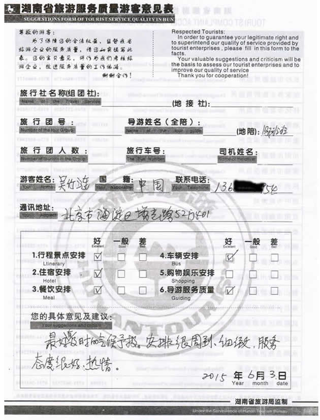 5月下旬,北京吳先生一行四位貴賓與湖南西部(張家界)中國國際旅行社工作人員——王丹取得聯(lián)系,經(jīng)過商談,雙方達(dá)成協(xié)議并簽訂旅游合同,于6月3日抵達(dá)張家界,開始張家界之旅。此次行程是由我社優(yōu)秀導(dǎo)游——烏玲玲,負(fù)責(zé)旅游接待工作,烏導(dǎo)在旅游過程中講解詳細(xì),客人也很滿意,在意見表上寫到:最好有及時的天氣預(yù)報(bào),安排很周到,細(xì)致,服務(wù)態(tài)度很好,很熱情!同時也感謝吳先生選擇湖南西部(張家界)中國國際旅行社,以及您對湖南西部國旅的信任與支持。我們會繼續(xù)努力,做好旅游接待工作。期待下一次與您的合作,祝您愉快!