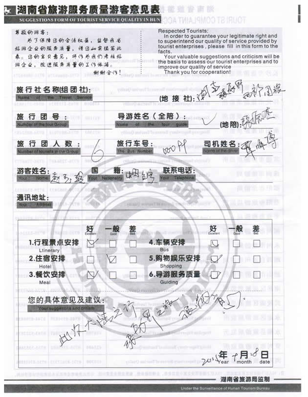 5月份,臺(tái)灣趙女士一行6位貴賓與湖南西部(張家界)中國(guó)國(guó)際旅行社工作人員——小龔取得聯(lián)系,經(jīng)過(guò)商談,雙方達(dá)成協(xié)議并簽訂旅游合同,于9月12日抵達(dá)張家界,開(kāi)始張家界之旅。此次行程是由我社優(yōu)秀導(dǎo)游——張杰負(fù)責(zé)旅游接待工作,張導(dǎo)在旅游過(guò)程中講解詳細(xì),客人也很滿(mǎn)意,在意見(jiàn)表上寫(xiě)道:此次大陸之行、張家界之旅、很滿(mǎn)意。同時(shí)也感謝趙女士一行貴賓選擇湖南西部(張家界)中國(guó)國(guó)際旅行社,以及您對(duì)湖南西部國(guó)旅的信任與支持。我們會(huì)繼續(xù)努力,做好旅游接待工作。期待下一次與您的合作,祝您愉快!