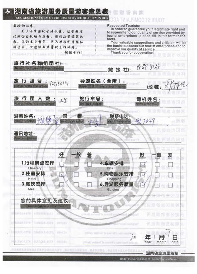 1月份,廣東梁女士一行25位貴賓與湖南西部(張家界)中國國際旅行社工作人員——張群取得聯(lián)系,經(jīng)過商談,雙方達(dá)成協(xié)議并簽訂旅游合同,于1月14日抵達(dá)張家界,開始張家界之旅。此次行程是由我社優(yōu)秀導(dǎo)游——鄧桃紅負(fù)責(zé)旅游接待工作,鄧導(dǎo)在旅游過程中講解詳細(xì),客人也很滿意。同時也感謝梁女士一行貴賓選擇湖南西部(張家界)中國國際旅行社,以及您對湖南西部國旅的信任與支持。我們會繼續(xù)努力,做好旅游接待工作。期待下一次與您的合作,祝您愉快!