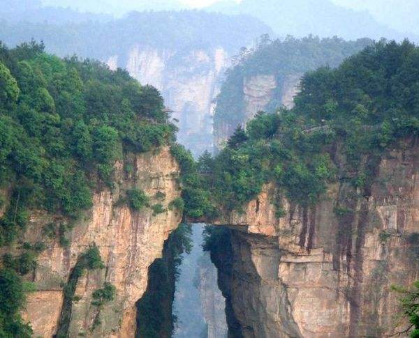 “后花園”至天下第一橋,有一條全長2000多米的游道,路面多為白色的條石鋪成,站在遠(yuǎn)處觀望,很像一條白色的綢帶打了兩個結(jié),一頭系在“迷魂臺”,一頭第在“天下第一橋”。信步漫游,沿途可欣賞到“拜仙臺”、“百丈絕壁”、“小洞天”、“情人谷”等別有情趣的景點,這里海拔不高,一般不受氣候影響,慢慢品味,定會使您賞心悅目。“天下第一橋”是張家界“十大絕景”之一。也是袁家界的標(biāo)志性景點,它是居于兩山之間形成的一座天然石橋,而兩山原為一體,橋身是兩山相連的關(guān)鍵部分,但因中間石質(zhì)較為薄弱,由于風(fēng)化、崩塌作用的影響,又經(jīng)過日曬雨淋、流水洗刷、山洪沖擊,久而久之,終于形成今天這一特別的奇景……。自杉刀溝上袁家界,沿絕壁頂部邊緣遨游,至于中坪“觀橋臺” 遙望千米之外,只見一天然石橋凌空飛架兩峰之巔,氣勢磅礴,奇?zhèn)ソ^倫,被稱為“天下第一橋”。石橋?qū)拑H3米,厚5米,跨度約50米,相對高度近400米。天下第一橋與夫妻巖并稱“張家界雙絕”。“天下第一橋”橋面寬兩米,厚四米,跨度為二十多米,高度為三百多米,是世界是迄今為止所發(fā)現(xiàn)落差最高的天然石橋。