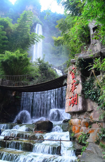 楊家界風(fēng)景區(qū)東接張家界,北鄰天子山,面積三十四平方公里。楊家界有香芷溪、龍泉峽和百猴谷三個游覽區(qū),其中知名景觀有一步登天、空中走廊、龍泉飛瀑、絕壁藤王、白鶴聚會等二百余處。最高峰“一步登天”海撥1130米。楊家界境內(nèi)溝壑縱橫,溪水長清,植被茂密,森林覆蓋率達(dá)95%。