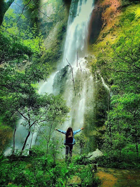 杉刀溝盡頭,有一抹泉水從200多米高的崖頂飄然而下,仿佛一匹白色長練自天而降。飛瀑下臨深潭,綠水泱泱,水霧漫漫,睛雨交加之日,時有彩虹飛升。每當(dāng)山洪瀑發(fā),瀑布猶如一巨龍,飛騰傾瀉,聲若巨雷,蔚為壯觀。