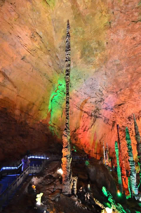 跨過中國游覽洞穴中跨度最大的石拱橋天仙橋,便進(jìn)入黃龍洞第三層天柱街了。天柱街是天上的街市,是神仙做生意的地方。天柱街以繁華似錦、春意盎然的“天上街市”為中心,西街花果山石柱石花重重疊疊,東街“天堂宮” 穹形洞頂高大幽深。順著長長的崩塌的斜坡往上看,兩根大石柱及壁流石被地下水溶蝕形成了奇妙的空洞,因從不同的地方可以敲出奇妙而悅耳的音符得名“石琴山”。一九八四年,中央電視臺拍攝電視專題片《地下明珠——黃龍洞》的時候,就是在這兩根石柱上敲擊出了一曲完整的《賣報歌》。